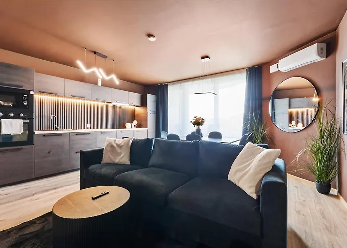 El Apartamento Lam Chocolate - Ac - Skyview dispone de facilidades de autoservicio, como una cocina bien equipada y una zona de comedor y un comedor al aire libre para disfrutar de sus comidas. El aeropuerto Bratislava, el más cercano, se encuentra a 5 km de este establecimiento, mientras que la estación de autobuses Matuskova está a unos 5 minutos a pie.